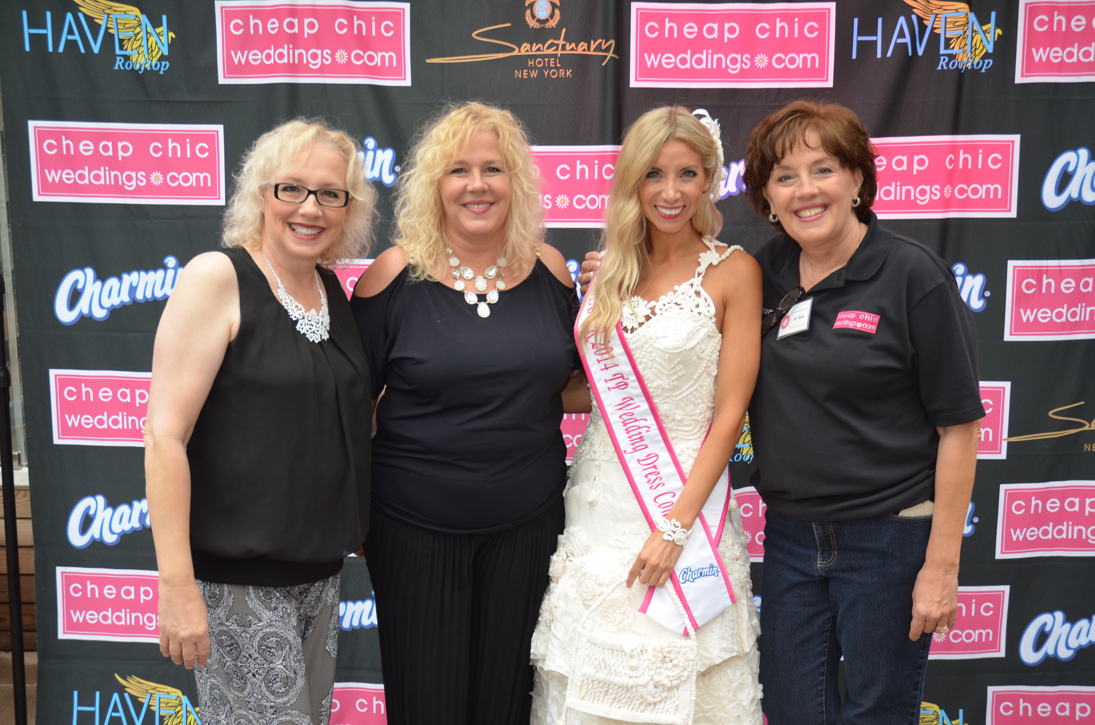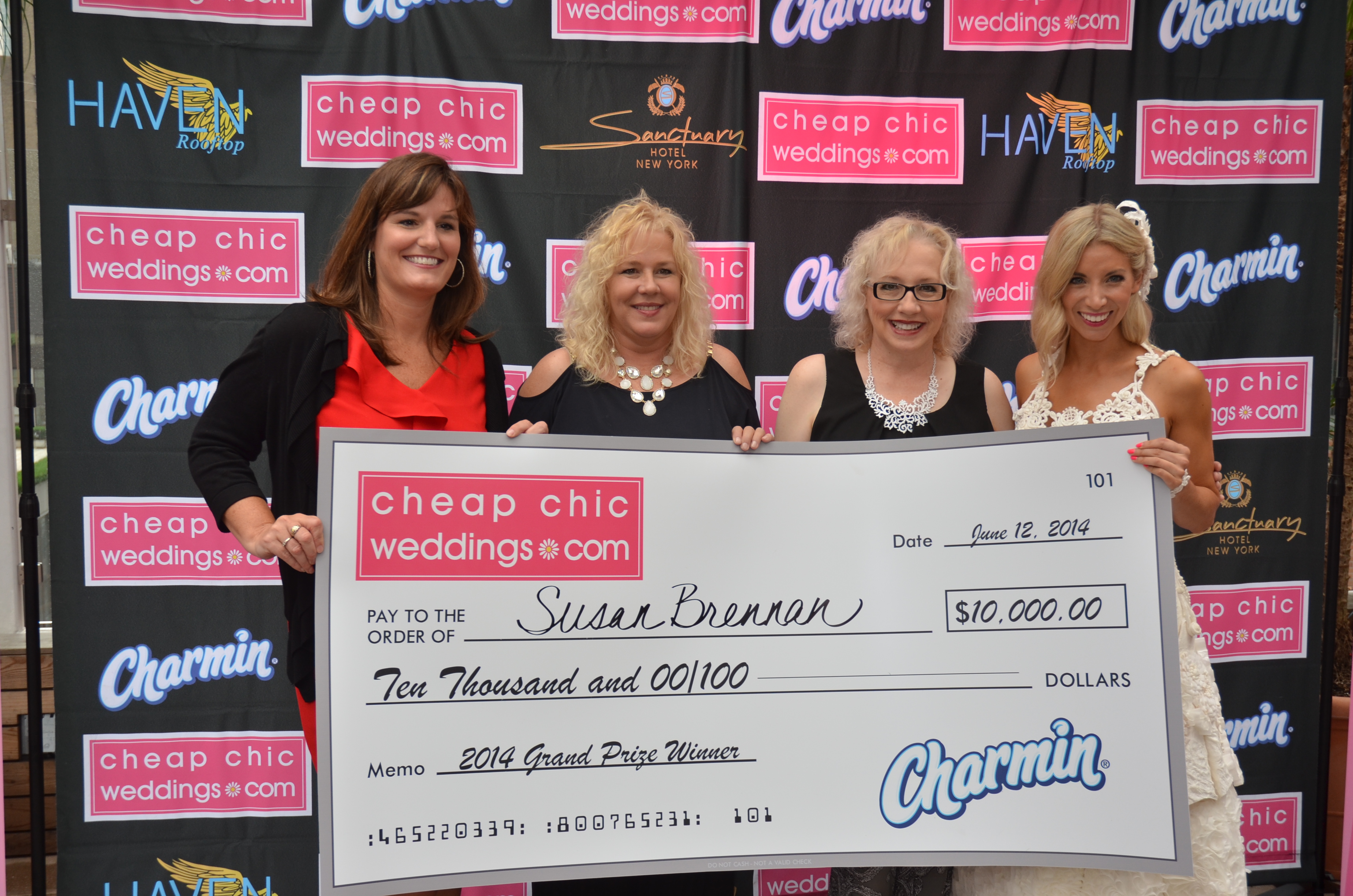 To celebrate our 10 Year Anniversary of the World Famous Cheap Chic Weddings Toilet Paper Wedding Dress Contest sponsored by Charmin, we flew all 10 of the finalists to New York City for the finale event at the Sanctuary Hotel on June 12, 2014. The Grand Prize Winner was Susan Brennan of Detroit, MI. Her TP Wedding Gown was a stunning convertible dress which went from long to short! Second place went to Katrina Chalifoux of Knoxville, TN and Third place went to Amber Mills of Dallas, TX.