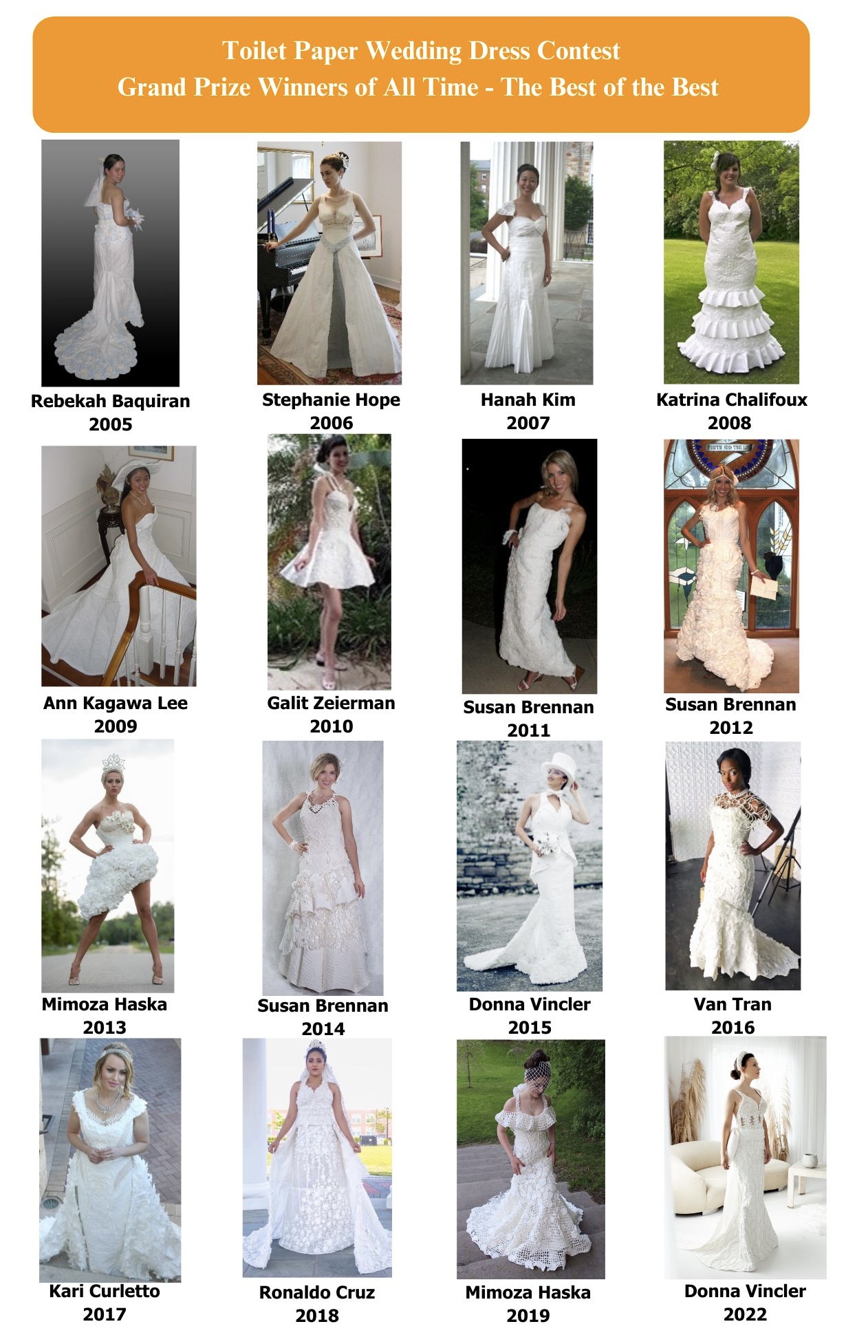 Celebrating 20 years of Creativity and Beauty! Each contest season, we ask creators to design and make a wedding dress and headpiece using only Toilet Paper, Tape, Glue and Needle & Thread.
